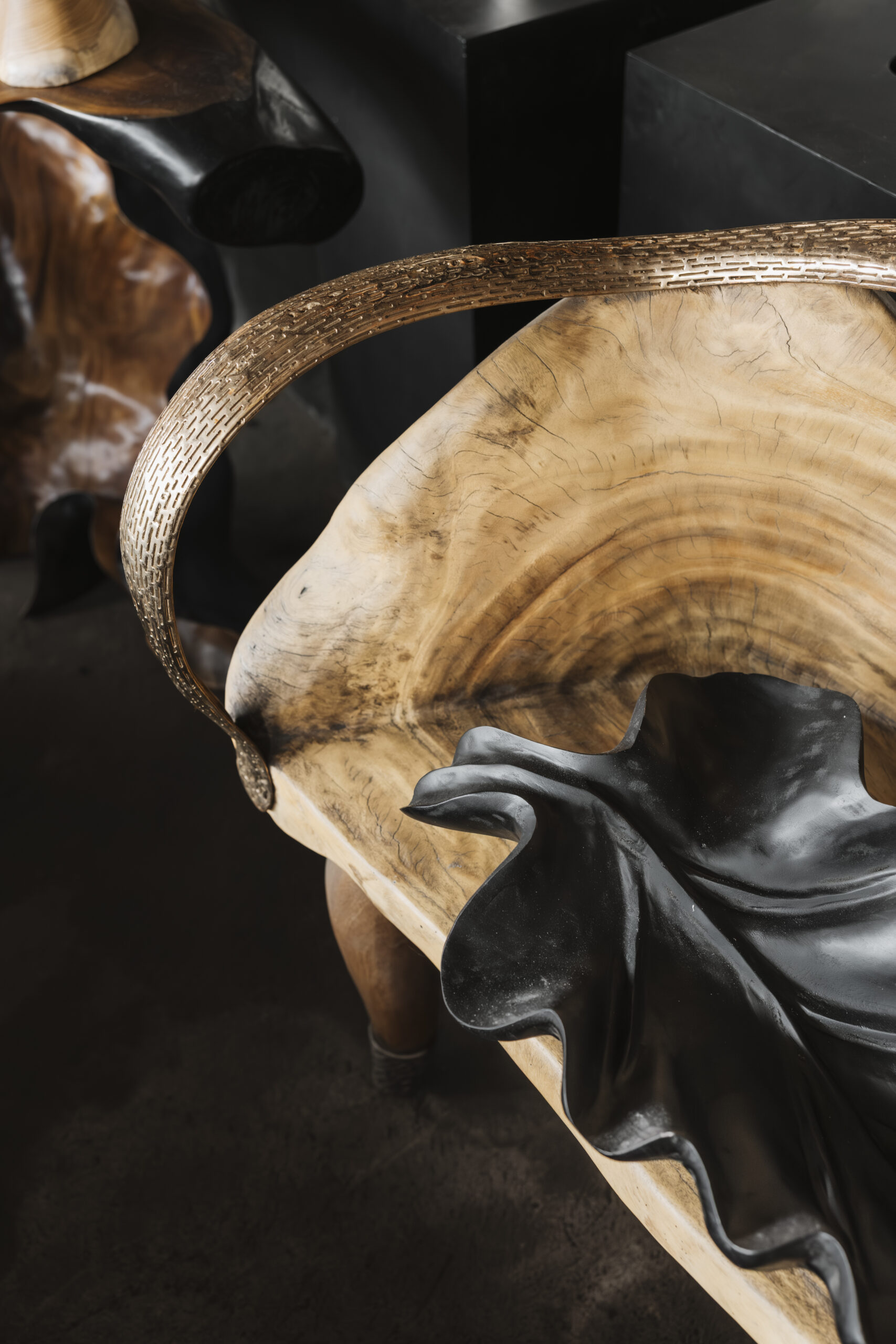 Jede Form entsteht aus der Natur, nicht aus einer Schablone. Jedes Möbelstück begeistert durch Wärme, Gewicht und Tiefe – nicht erzeugt, sondern bereits vorhanden. Balinesische Handwerkskunst folgt dieser Substanz mit Respekt und Zurückhaltung. Schwarze, goldene oder silberne Metallelemente ergänzen das Holz bewusst zurückhaltend und setzen einen Kontrast, ohne mit ihm zu konkurrieren. So entstehen Möbel, deren Ausdruck sich nicht gestalten lässt, sondern aus dem Werkstoff selbst hervorgeht – ruhig, ehrlich und unverwechselbar – AYAM.